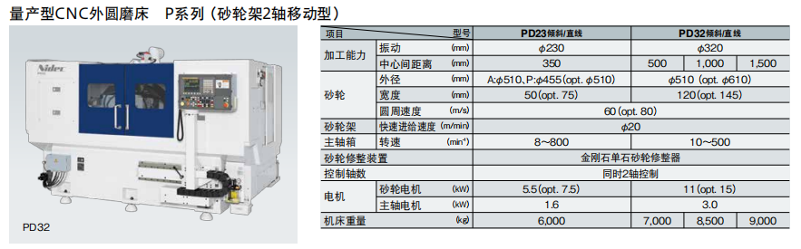 · 砂輪圓周速度 60 m/s(可選 80 m/s,PD32)的高速重磨削:砂輪軸標(biāo)配11kW高輸出電機(jī),標(biāo)準(zhǔn)規(guī)格為砂輪圓周速度60m/s、砂輪寬度120mm(可選最大145mm),可實(shí)現(xiàn)寬砂輪的高速單次重磨削。(PD32)(PD32)