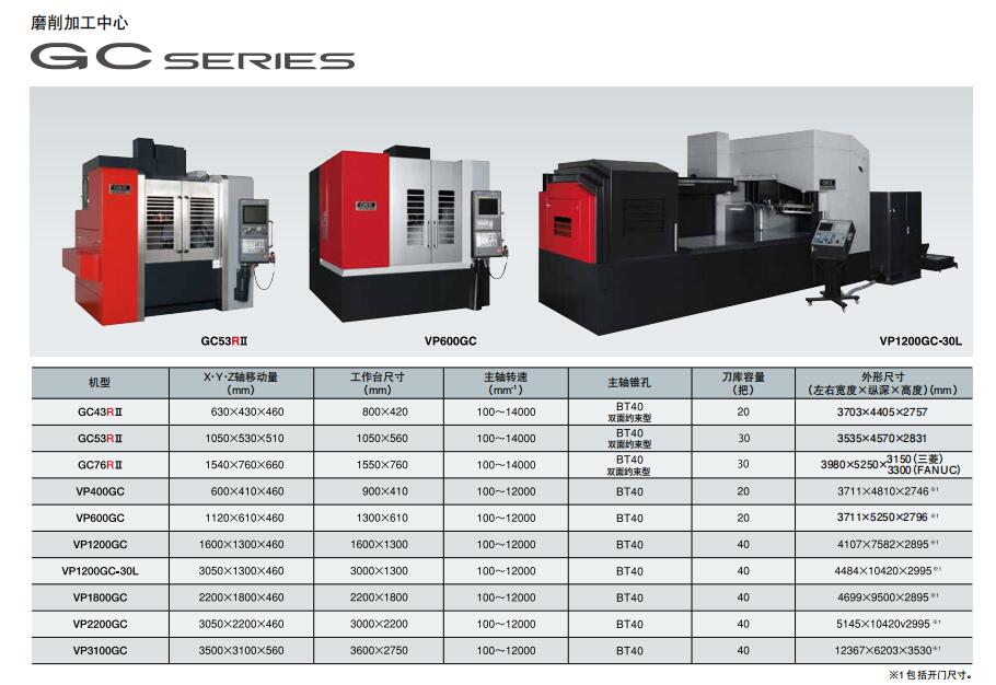 - · GC53RII可加工多種材料,效率高、精度高。此外,通過自動磨石刀具交換裝置和NC功能,該模型促進了磨削過程的自動化。